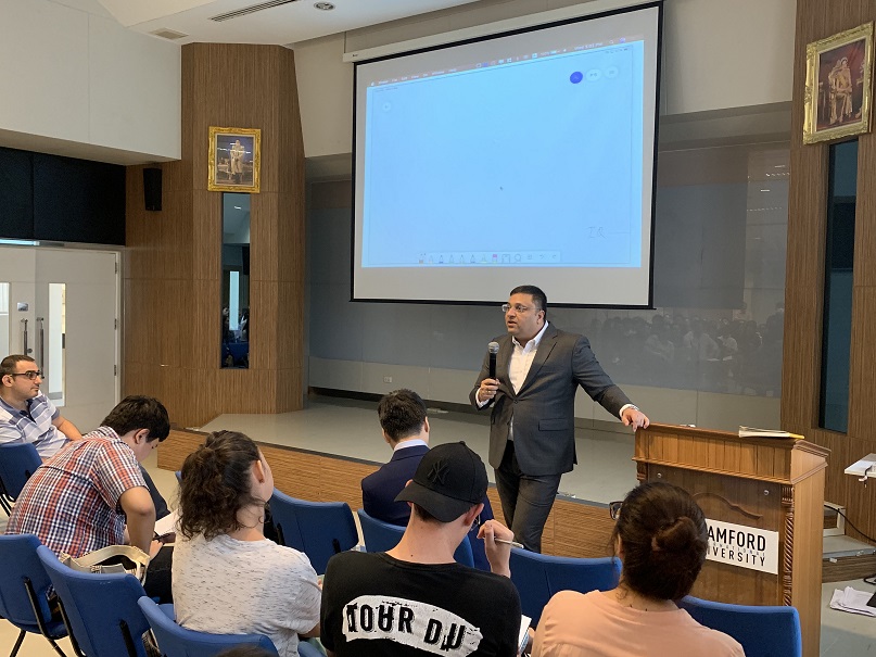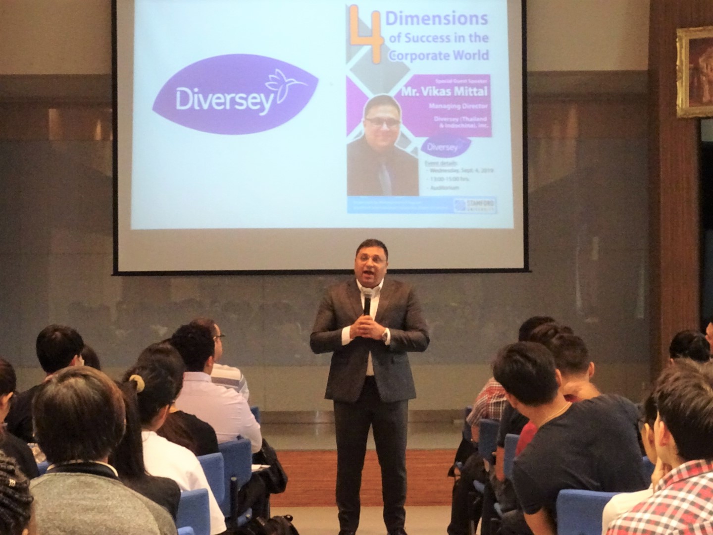 Guest speaker, Mr. Vikas Mittal, visited Stamford University on 4th of September, 2019, to share his experience and knowledge to nearly 100 lecturers and students from the Management Program. He is the Managing Director of Diversey (Thailand, Indonesia , Indochina,) Inc., which provides cleaning and hygiene products and technologies for global industries in hospitality, healthcare, food and beverage, and food service.