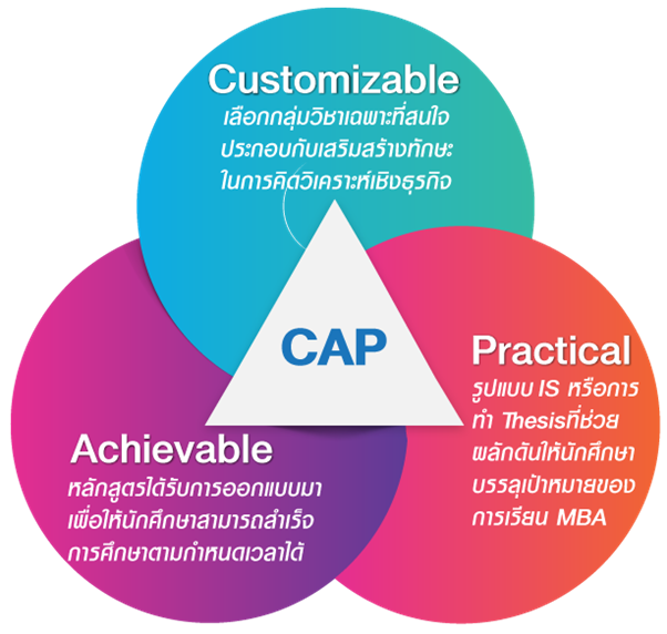 หลักสูตร MBA ใหม่ ของ Stamford เปิดโอกาสให้นักศึกษาได้พัฒนาทักษะเชิงลึก ด้วยการเรียนวิชาเลือกในกลุ่มวิชาที่สนใจ ได้แก่ International Business Management และ Digital Marketing ประกอบกับทางเลือกในการศึกษาค้นคว้าอิสระ (IS) รูปแบบต่างๆ ทำให้นักศึกษาสามารถพัฒนาทักษะเฉพาะด้านในเชิงลึกได้มากยิ่งขึ้น หลักสูตร MBA ได้รับการออกแบบภายใต้องค์ประกอบหลัก 3 อย่าง “CAP” ที่ Stamford มองว่าเรียนต้องการจากหลักสูตร MBA