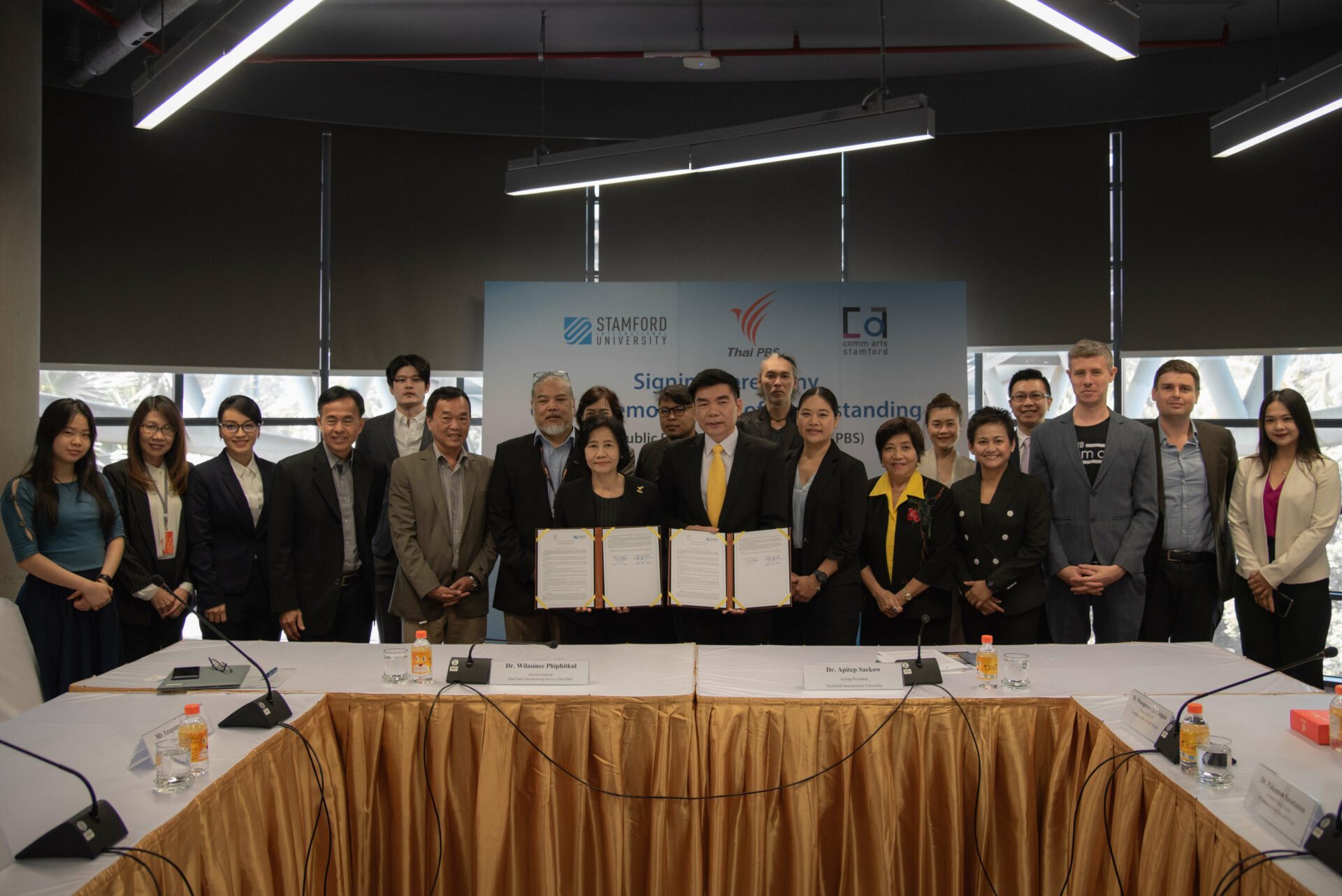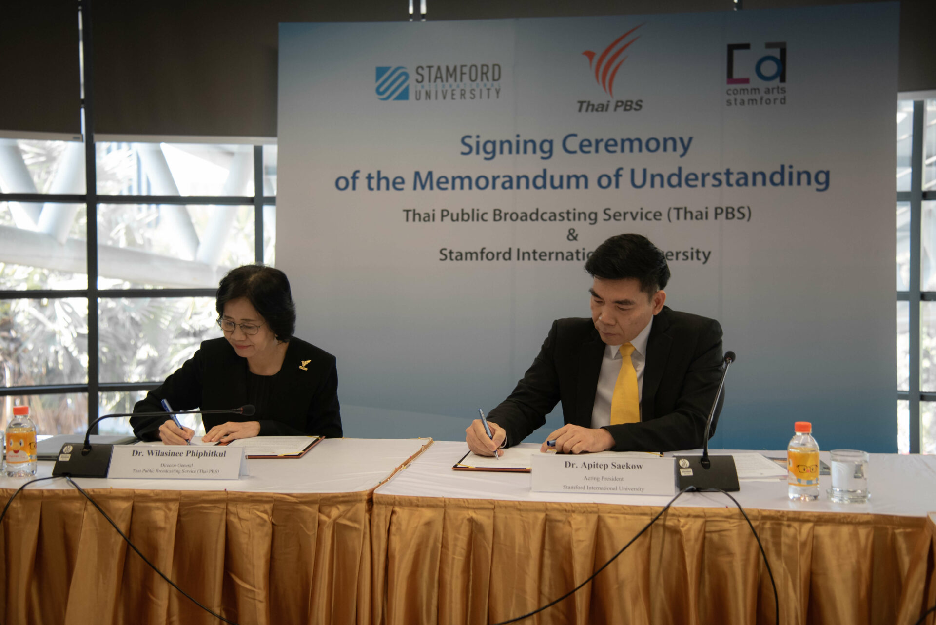 On December 6, 2019 at the Thai Public Broadcasting Service (Thai PBS), Bangkok, Thailand, Dr. Apitep Saekow, Acting President of Stamford International University, signed the Memorandum of Understanding (MOU) with Dr. Wilasinee Phiphitkul, Thai PBS Director-General. The Dean, lecturers and staff from the Communication Arts Department also attended the signing ceremony.